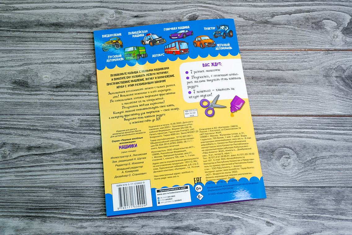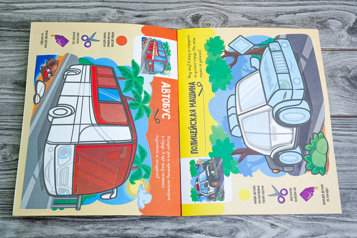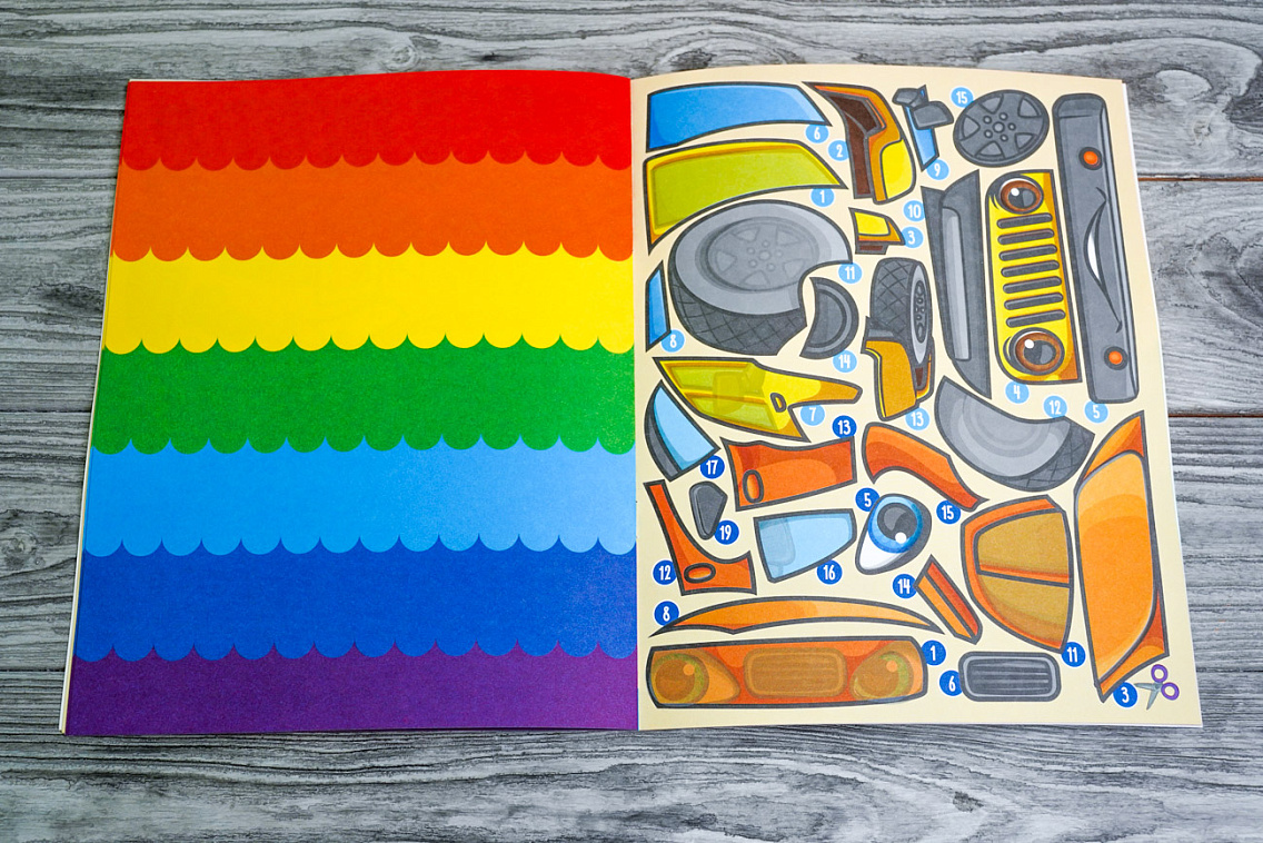 Каждой машине соответствует свой цвет, а каждому фрагменту для вырезания — свой номер. Выучите семь цветов радуги и освойте счет до 10!