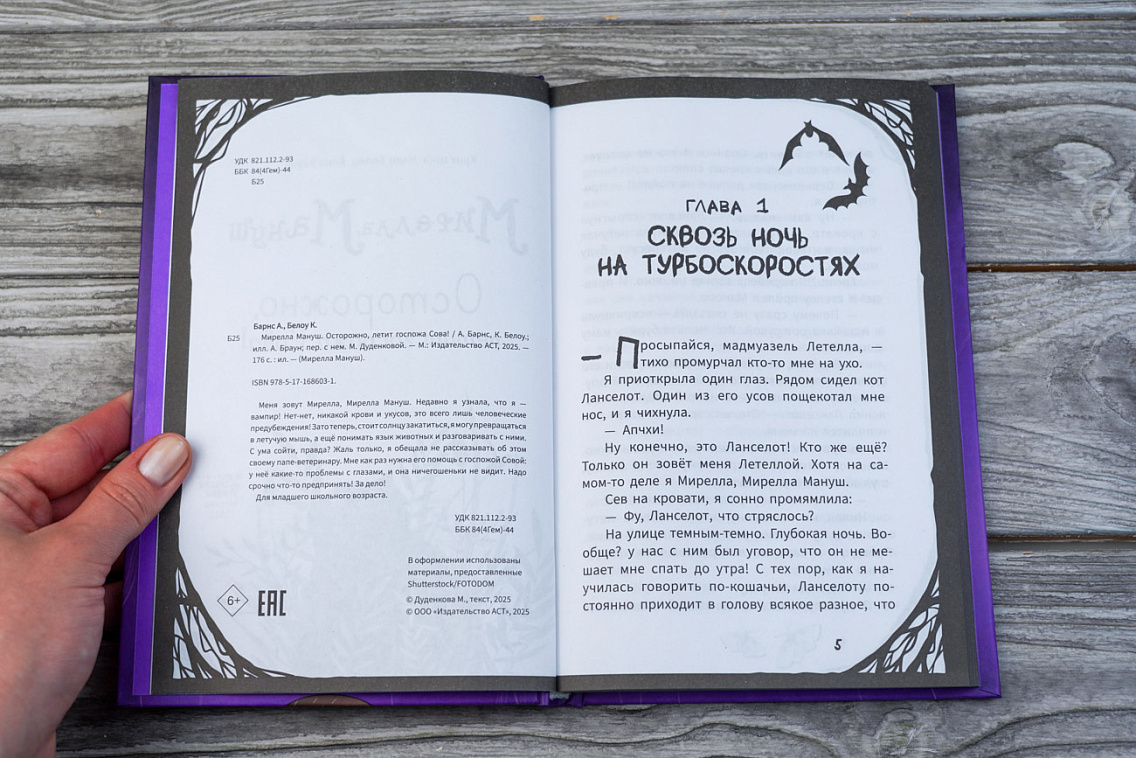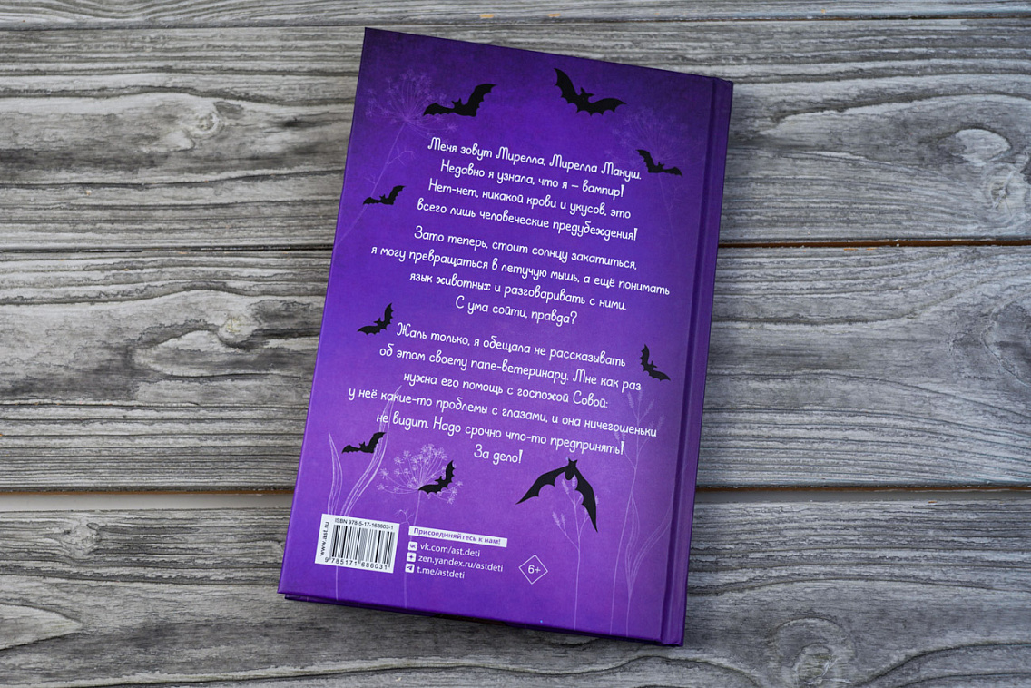 Меня зовут Мирелла, Мирелла Мануш. Недавно я узнала, что я — вампир! Нет-нет, никакой крови и укусов, это всего лишь человеческие предубеждения! Зато теперь, стоит солнцу закатиться, я могу превращаться в летучую мышь, а ещё понимать язык животных и разговаривать с ними. С ума сойти, правда? Жаль только, я обещала не рассказывать об этом своему папе-ветеринару. Мне как раз нужна его помощь с госпожой Совой: у неё какие-то проблемы с глазами, и она ничегошеньки не видит. Надо срочно что-то предпринять! За дело!