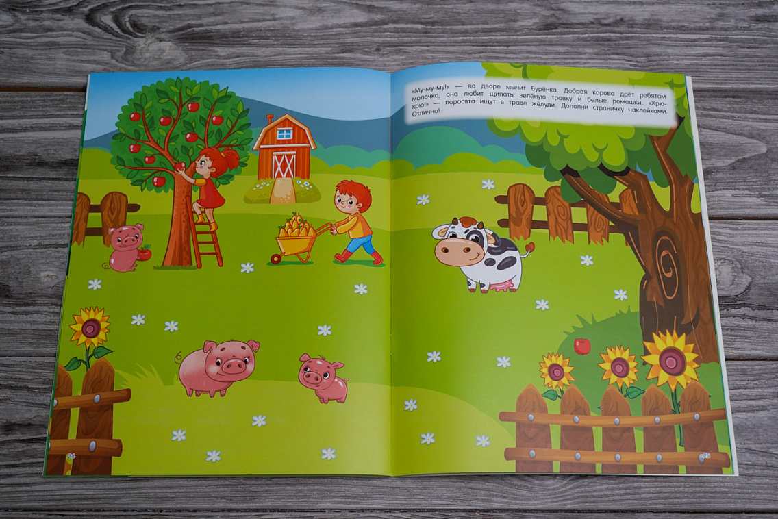«На ферме» — это креативная и забавная книга. 600 качественных наклеек с изображением домашних животных. Ребёнок сам решает, как расположить наклейки на красочных фонах. Это отличная возможность для развития воображения, мелкой моторики и логики.