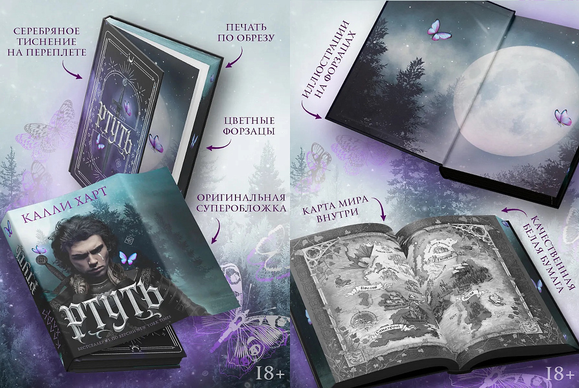 Книга Калли Харт «Ртуть» появится в сентябре в двух вариантах оформления. Подарочное издание выйдет в оригинальной суперобложке, с серебряным тиснением на переплете, бабочками на цветном обрезе, иллюстрациями на форзацах и картой мира внутри. За предзаказ получите бонус в виде открытки и стикерпака.
