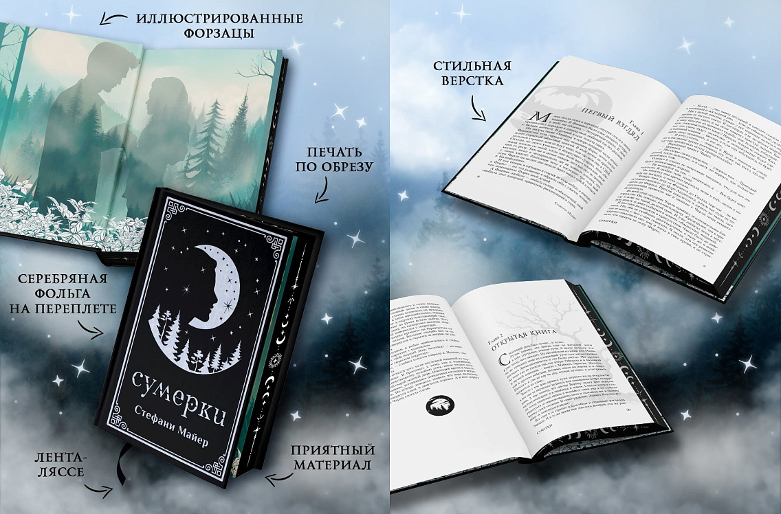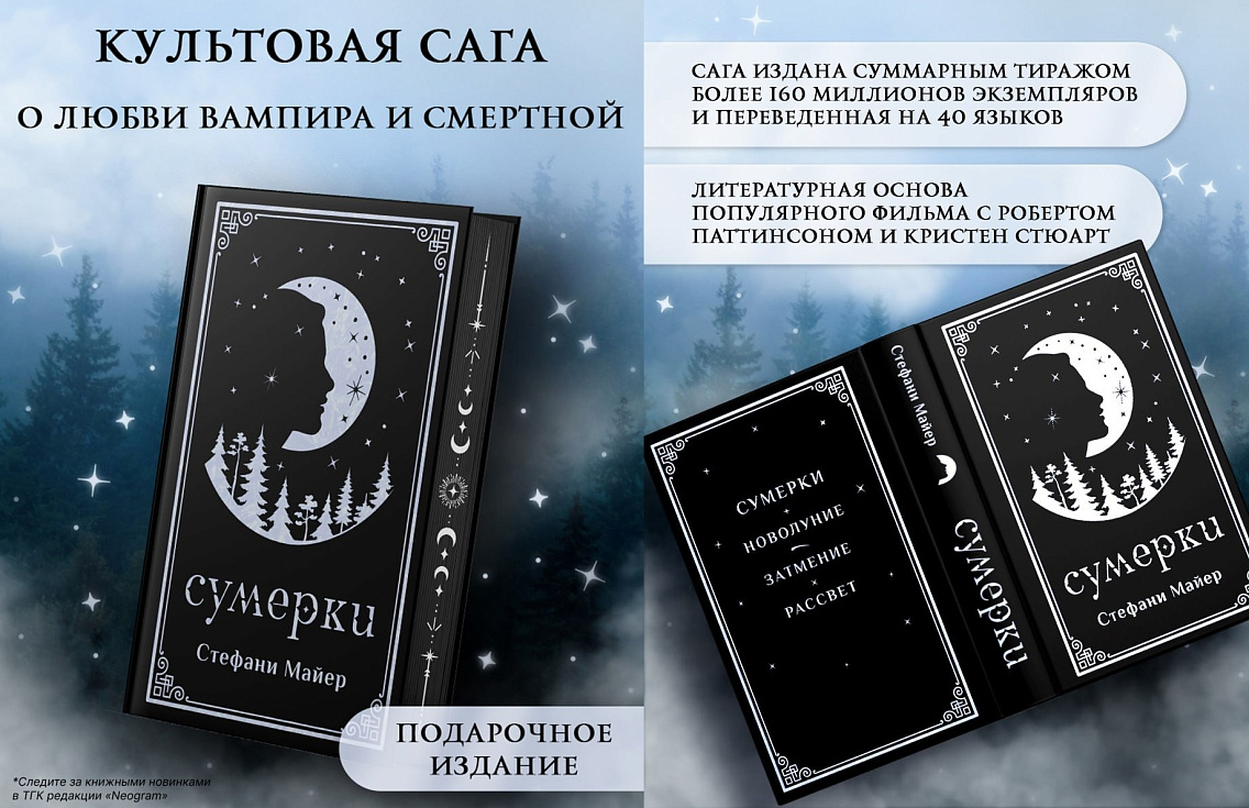 Редакция Neoclassic готовит особенный релиз для поклонников вампирской саги Стефани Майер. В январе в продажу поступит подарочное издание первого романа — «Сумерки». Нарядная книга поможет снова пережить историю Беллы и Эдварда в ярких красках. Редакция планирует выпустить в обновленном оформление и другие части саги.
