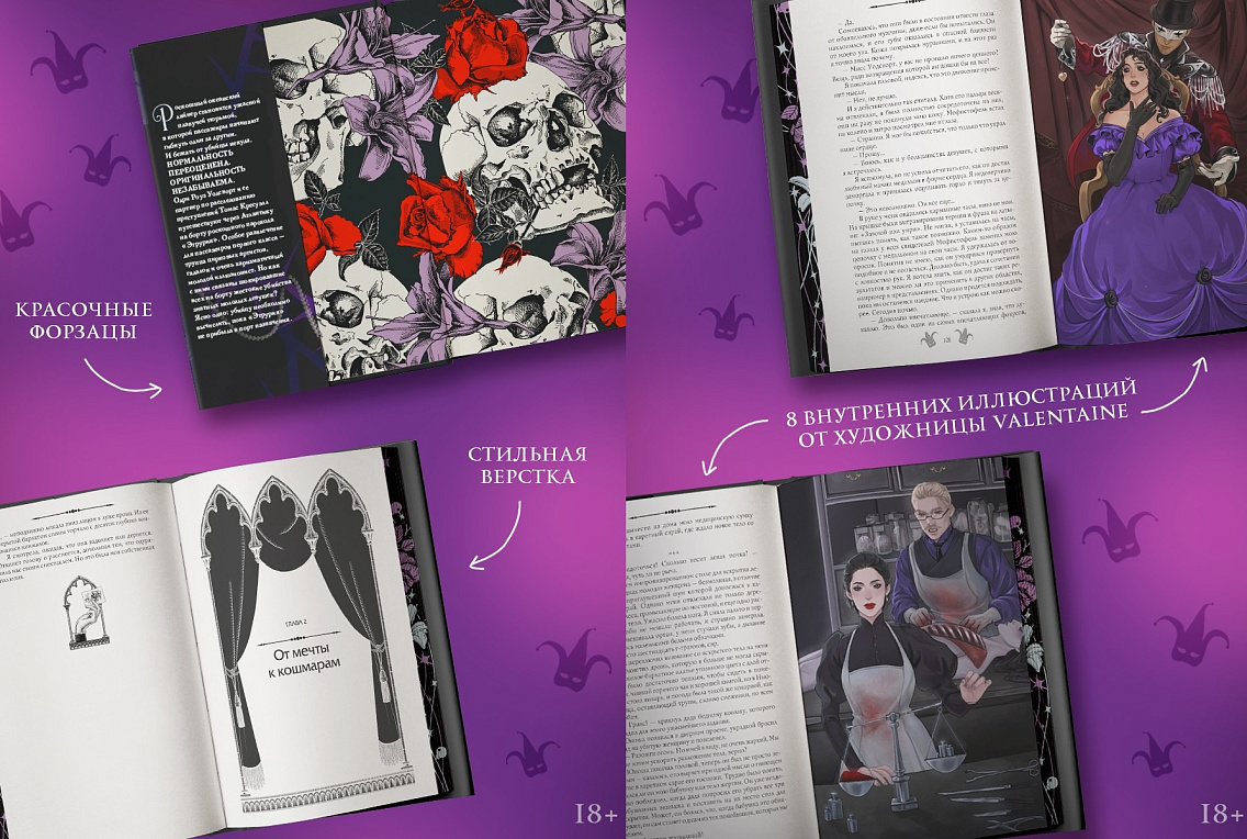 Подарочное оформление украсит полку коллекционеров. Сборник издадут в суперобложке от художницы Valentaine, с узорами на обрезе, фольгой на переплете, нарядными форзацем и нахзацем и закладкой-ляссе. Внутри найдете восемь иллюстраций и двусторонний супер-постер от художницы Karma virtanen.