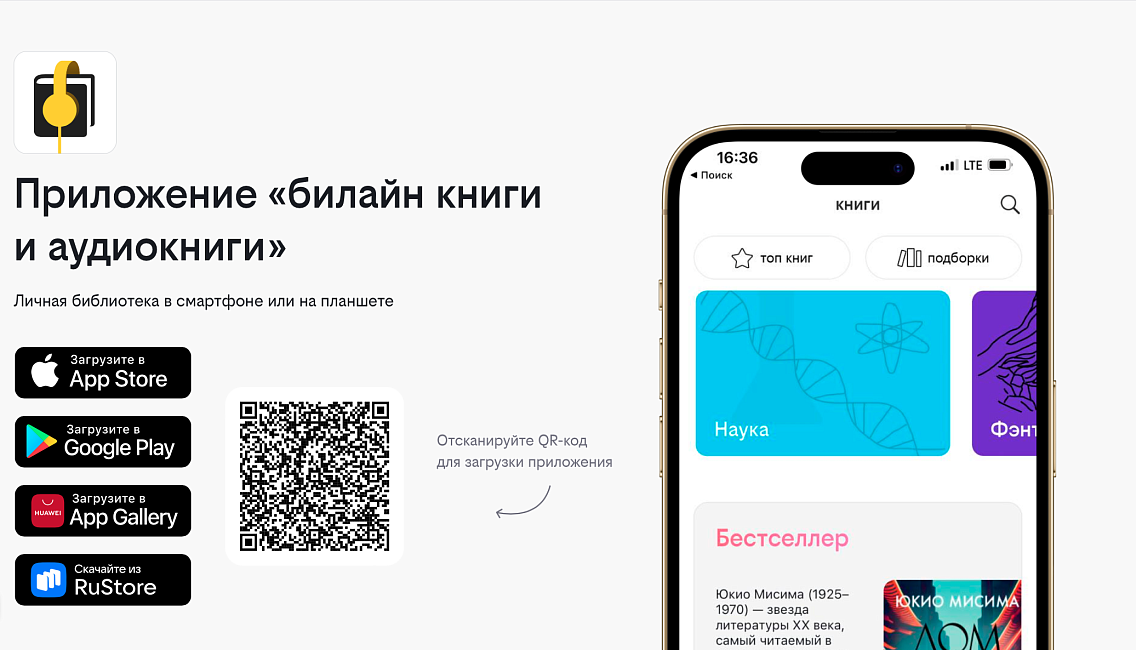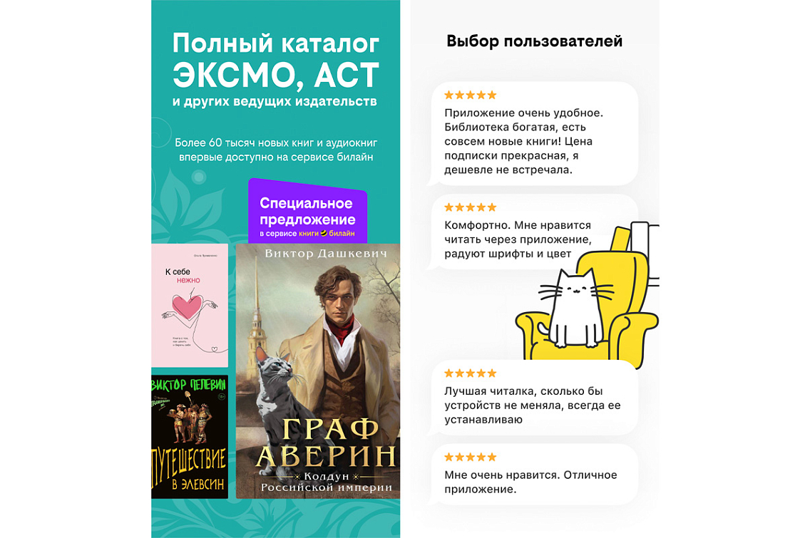 С ноября 2024 года сервис книги билайн пополнился каталогами ведущих издательств страны АСТ, ЭКСМО и других. Теперь библиотека насчитывает более 350 000 электронных и аудиокниг разных жанров, в том числе больше 90 тыс. — в аудио формате.