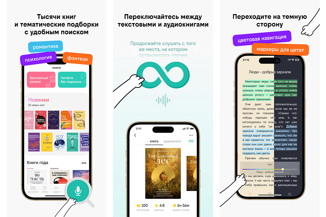 Сервис предлагает читателям множество удобных инструментов: голосовой поиск, синхронизация электронной и аудиокниг, возможность пользоваться приложением без Интернета, расширенный функционал мобильного ридера и веб‑версию, в которой тоже можно работать с книгами.