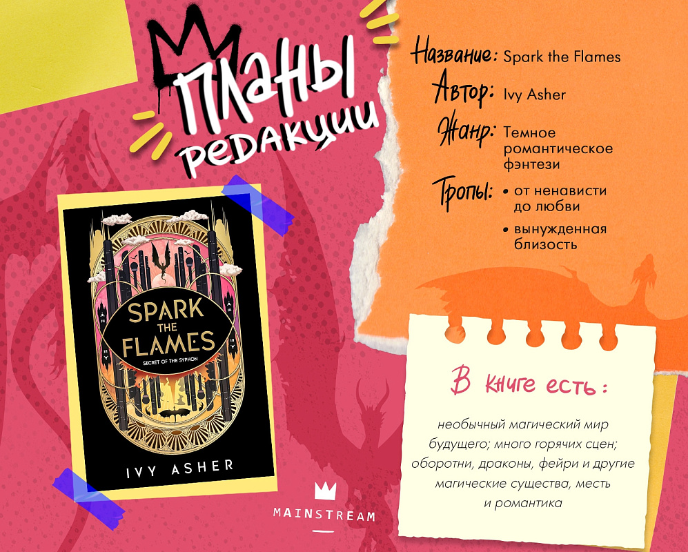 Редакция Mainstream приобрела права на темное романтическое фэнтези Айви Эшер — Spark the Flames (дословно: «Разожги огонь»). Эта история, полная страсти, магии и опасности. Американское издание вышло весной 2025 года, а в переводе на русский книга ожидается в 2026 году.