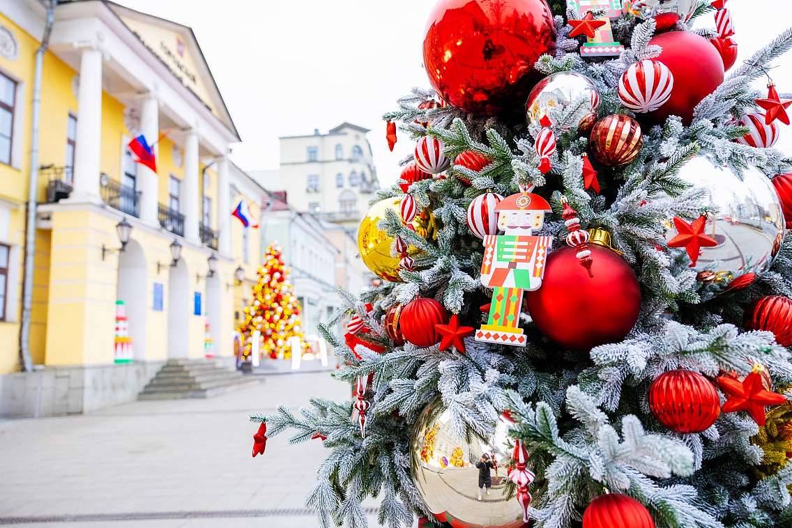 Площадку украсили живые ели, наряженные уникальными игрушками, разработанными специально для проекта. Под ветвями — яркие подарочные коробки, создающие атмосферу ожидания чуда. Композицию дополняют большие фигуры Щелкунчиков и ледяные зеркальные скамейки, превращающие пространство в настоящий зимний театр фантазии.