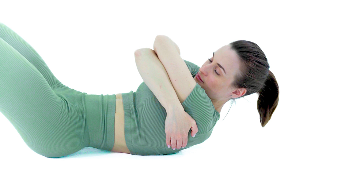 Лежа на твердой поверхности, скрестите руки на груди, максимально разведя лопатки. Согните ноги в коленях, оставив стопы на полу, и приподнимите таз над полом.